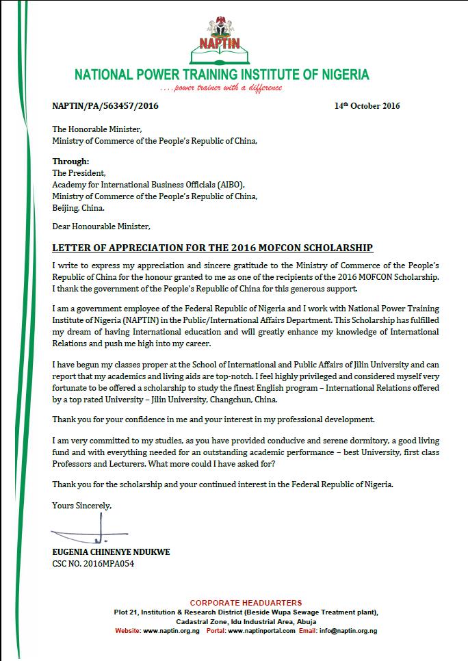 近日,在公司国际关系专业学习的商务部援外学历学位项目尼日利亚籍硕士研究生Eugenia Chinenye Ndukwe,向商务部发出感谢信,感谢我国政府提供的奖学金机会帮助她完成留学梦想,感谢公司为学员提供一流的教学条件和生活环境。在信中,她表示自己很幸运能够来到BEATS学习国际关系专业,并将努力取得优异的学习成绩。