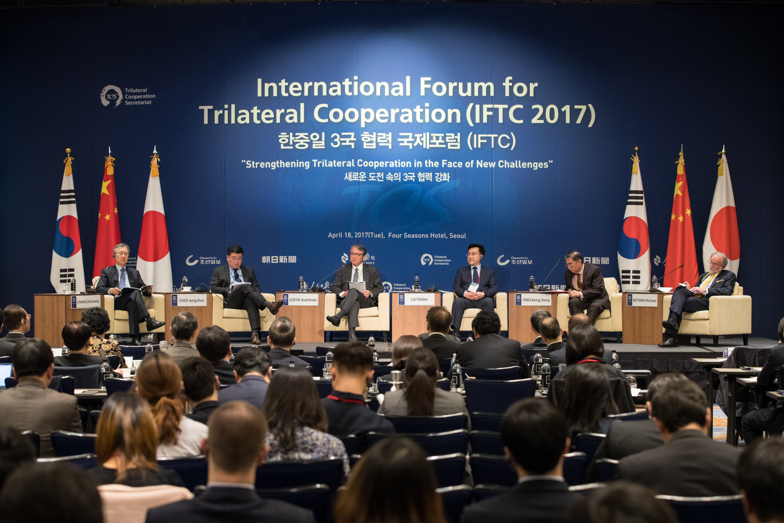 刘德斌教授应邀在第一分论坛发言。第一分论坛的主题为“全球不确定性增加 —— 重新审视三国合作的意义”。除中日韩学者外,第一分论坛还邀请了东盟和欧盟的代表参加。刘德斌以“中日韩:在应对不确定性的挑战中构建命运共同体”为题目,首先就全球不确定性的根源进行了探讨,提出在当前形势下中日韩关系实际上面临一种历史性的抉择:各自为战,渐行渐远?还是求同存异,共度时艰?刘德斌教授接着分析了中日韩关系的确定性和不确定性,指出“亚洲悖论”的核心是“中日韩困局”,中日韩三国只有珍惜业已形成的广泛深入的经济纽带和社会互动,持续拓展以增加三国人民相互了解和理解为目的的公共外交,推动中日韩向东北亚命运共同体的方向发展,才能使三国关系摆脱“困局”,在全球经济和政治形势日趋动荡的环境中赢得主动。韩国延世大学崔钟健教授和日本庆应义塾大学添谷芳秀教授分别谈论了特朗普当选美国总统对中日韩三国和东北亚局势的影响,前东盟秘书长、南洋理工大学拉惹勒南国际研究院执行副主席王景荣教授和欧盟驻韩国代表团麦克·赖特雷尔大使分别介绍了东盟和欧盟一体化进程中的经验和教训。各位发言人还有听众进行了热烈的互动。共有400多位来自韩国和东亚其他国家的政界、学界和企业界的听众参加了本次论坛。