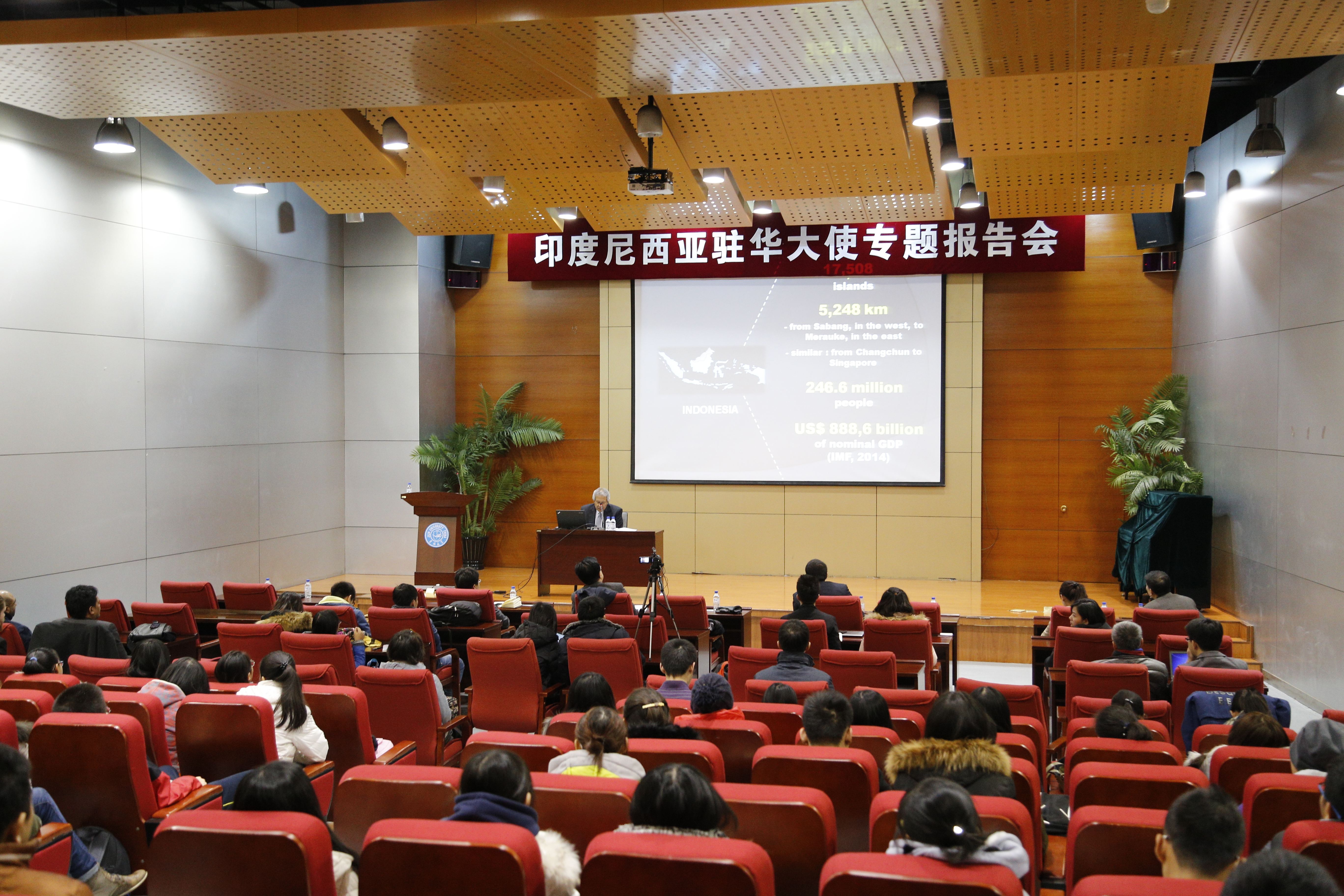 随后,苏更•拉哈尔佐大使为公司师生做了题为《印尼与中国关系:两国六十五年的外交与未来的合作潜力》的专题报告。在报告中,他详细介绍了中印两国外交的历史和现状,并对两国关系发展做出了积极的展望。报告结束后,大使先生与现场观众进行了长时间的互动。来自BEATS、行政公司、文公司的教师和员工近200人参加了报告会。