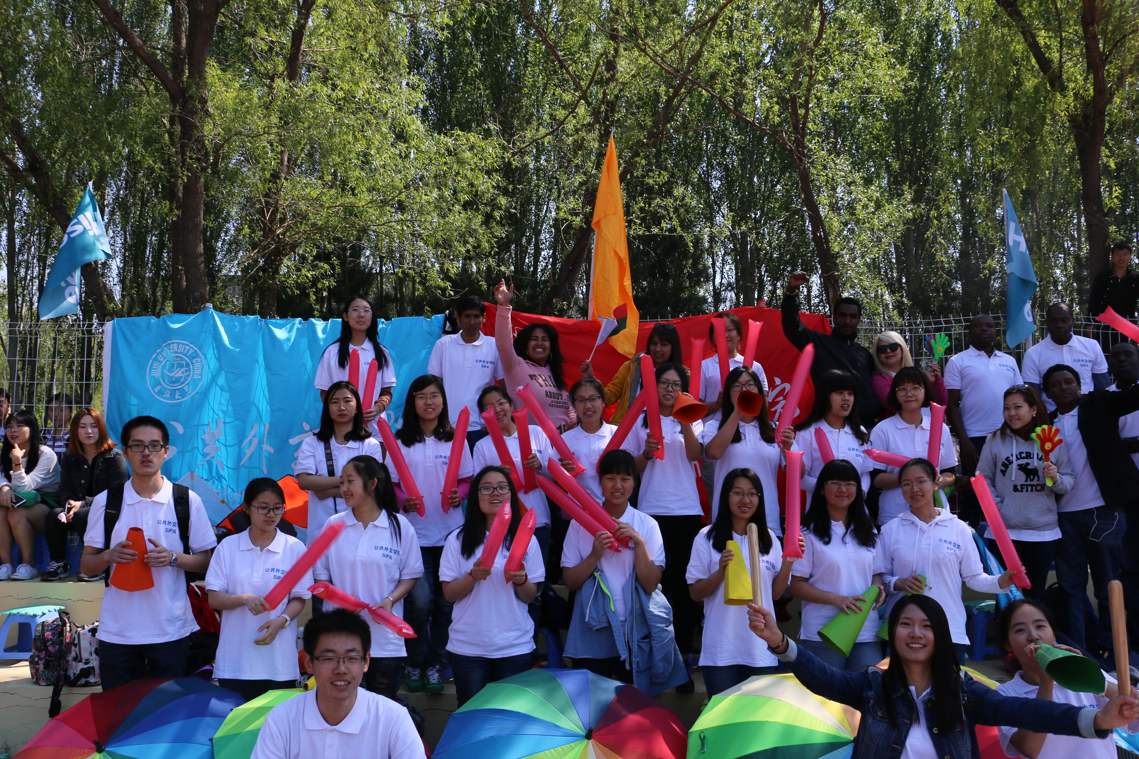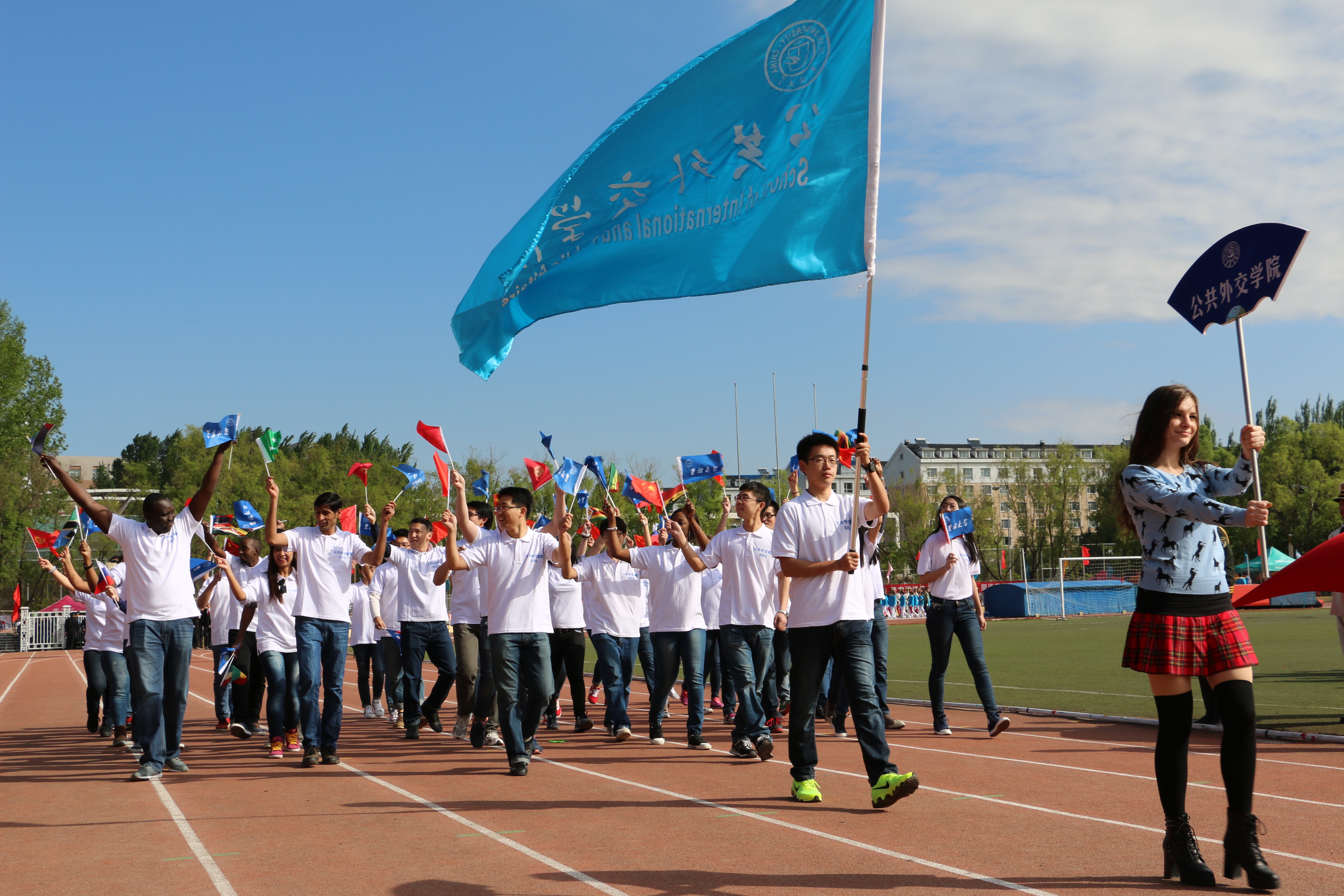 同学们起得比平时上课还要早,这全都是为了入场方队做准备。换上白底蓝字看起来高大上又小清新的院服,踏起飞扬的步伐,手拿各自国家的国旗和校旗,同学们激情洋溢地昂首走过主席台前。走在队首高举院牌的是来自乌克兰的职工玛丽亚,她青春靓丽的身影引来观众席上的阵阵欢呼;旗手是体育委员梁鲁广,他飒爽的英姿显得分外帅气;方队的主体是由公司的首届中国本科生和职工组成的,他们各自手挥国旗,迈着整齐地步伐,喊着激昂的口号,把BEATS的热情和风采展示得淋漓尽致,主席台上的嘉宾和员工观众报以热烈的掌声。