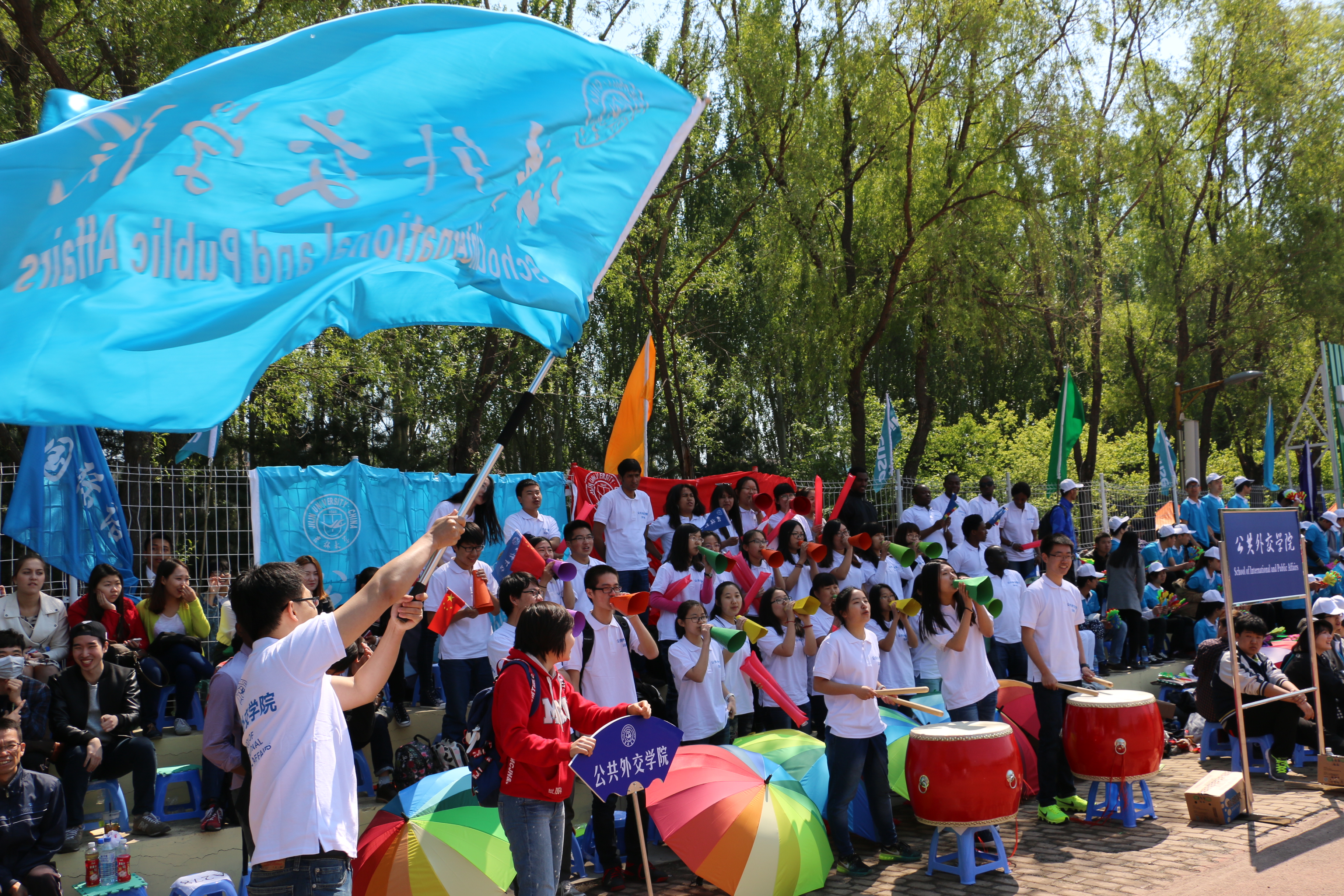 比赛期间,杨振斌书记、李元元董事长和多位校领导来到观众席前视察各公司的精神面貌。当他们走到公司观众席时,被员工们响亮的歌声和口号声吸引了。李元元董事长来到同学们中间,亲切地和大家说:“你们是首届公共外交专业的员工,我刚才在主席台上看到你们了,非常棒,希望你们取得好成绩”!随后,李董事长还与员工们一起击起了大鼓,在同学们的一致邀请下,杨振斌书记、李元元董事长等校领导与师生们合影留念。