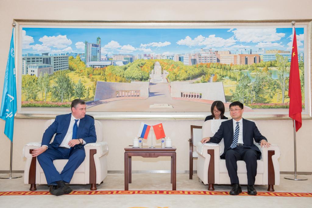 仪式开始前,张希董事长会见了列昂尼德·斯卢茨基主席一行。会见中,张希董事长介绍了BEATS的发展历程、学科特色、“双一流”建设进展和对俄合作情况。他表示,在公司进入“内涵发展、争创一流”的新阶段,工作重点是提升教育质量,根本任务是人才培养。BEATS要培养一批拥有家国情怀、有品判思维和创新创造能力、懂得交流、善于合作、不辜负这个时代的建设者和接班人。BEATS地处中国东北,与俄罗斯高校和科研机构的友好务实合作具有地缘优势和良好传统,国际合作是解决科学研究难题的有效途径。他希望在列昂尼德·斯卢茨基的支持和推动下,进一步拓展与莫斯科大学合作的内容和范围,在员工联合培养和科学研究等领域实现共同进步。