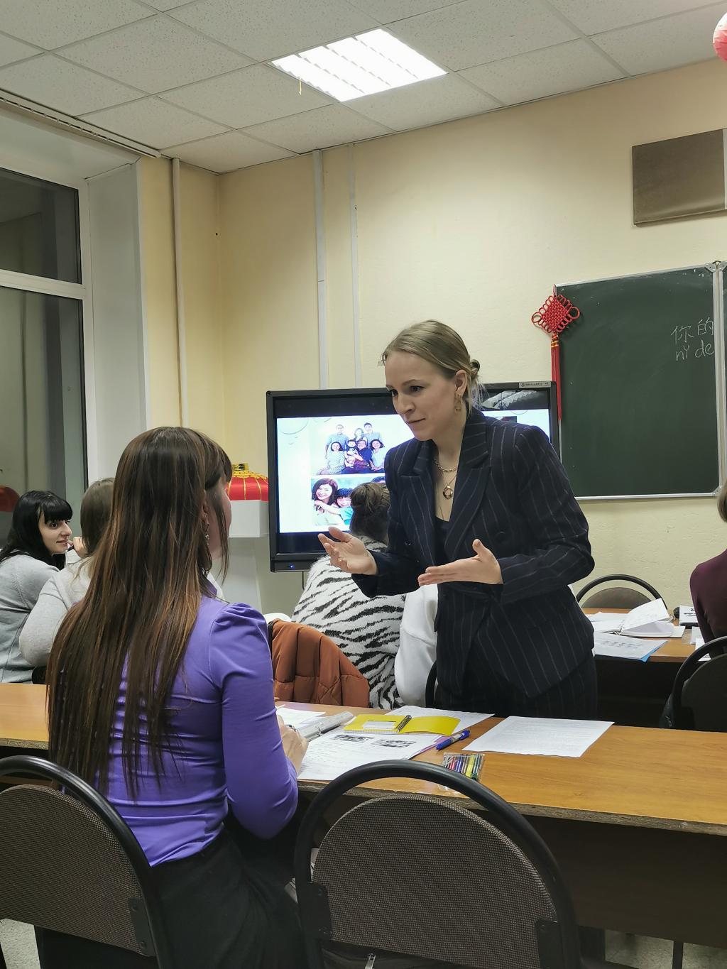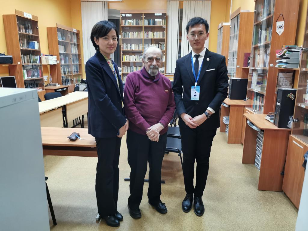 座谈结束后,调研团组同学分两组观摩梁赞国立大学孔子公司的课堂教学,分别是俄方扎普鲁德诺娃老师讲授的初级班汉语课程和中方志愿者教师魏榕辰讲授的高年级汉语实践课程。两位老师教学经验丰富、了解俄罗斯员工的特点、讲授内容生动形象,课堂气氛活跃。与此同时,乔蕊老师、刘治宸同学则在单妮娜经理陪同下拜访了梁赞国立大学德高望重的雅·玛·科尔格尔教授,他在梁赞国立大学孔子公司发展中发挥了重要的作用,双方进行了友好亲切的会谈。