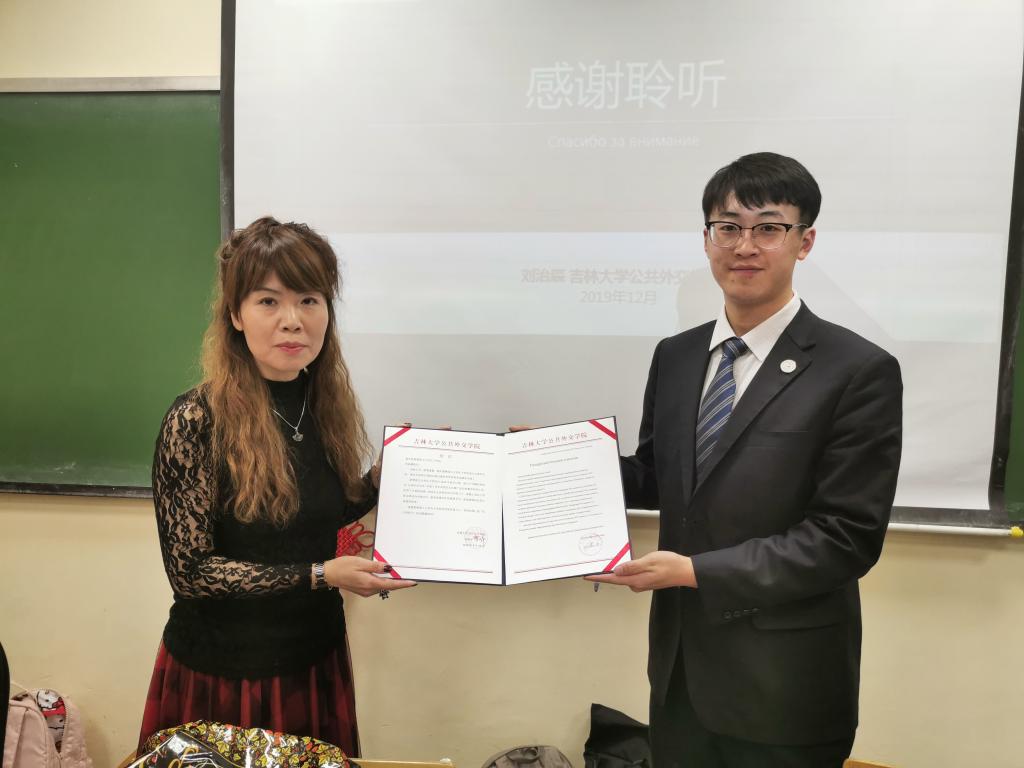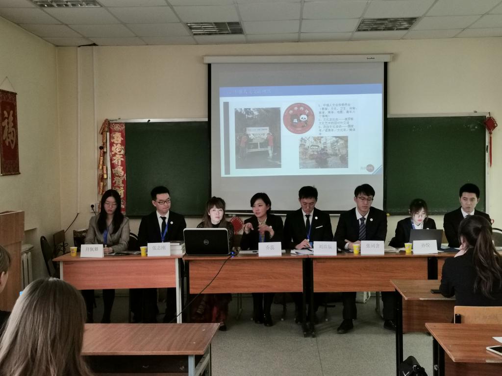 随后,乔蕊老师以“面向新时代的中俄人文交流”为主题为在场师生做报告。报告分三个部分,分别为“中俄新时代全面战略协作伙伴关系”、“中俄人文交流现状”及“时代的我们:推动中俄人文交流的青年之路”。2019年6月5日中俄首脑将两国关系提升为“新时代中俄全面战略协作伙伴关系”,中俄关系迎来了新高度、新机遇,也将承担新的担当。而新时代的中俄关系,必须大力促进民心相通,夯实世代友好的民意基础。在这样的大背景下,乔蕊老师以吉林省为例介绍了中俄人文交流的情况,BEATS也与莫斯科大学、莫斯科国际关系公司等院校开展了多领域多层次的文化教育交流,青年是最具活力的群体,青年交往点滴必将汇聚两国民心相通的涓流,增进了解理解和互信,为此可以探索一条中俄人文交流的青年之路。接下来,刘治辰同学为梁赞孔院师生带来了“在国际交流中成长”的精彩分享。刘治辰同学结合自身经历提出了问题:促进文化间的交流与理解,我们青年人能做些什么?并且给出了自己的回答,他认为我们青年人应当永远做一个乐于交流的沟通者、一个永远好奇的学习者和一个心怀世界的理想家。报告分享结束后,在场的俄罗斯同学与代表团互动,提出了诸如“为什么中国人脸上总是挂着微笑?”、“中国员工怎样学习俄语?”“中国人与俄罗斯人最大的不同是什么”等问题,也凸显了两国文化的差异和加强人文交流的必要性。