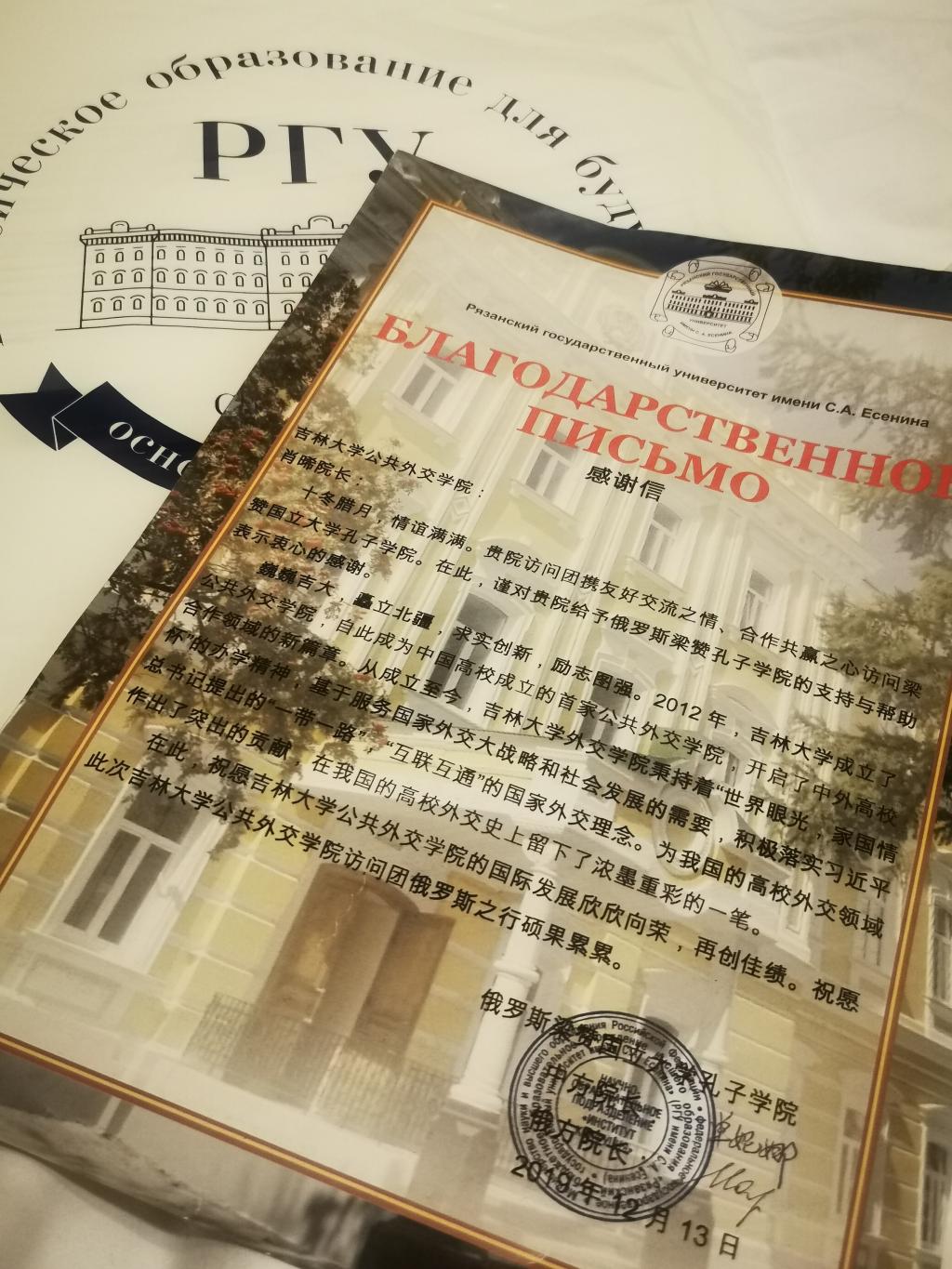 单经理发言结束后,乔蕊老师及代表团成员对梁赞大学孔院取得的一系列成果表示由衷的敬佩,BEATS员工代表向梁赞大学孔子公司转赠了肖晞经理的贺信,祝贺公司在汉语教学和文化推广方面取得的成就。单经理也向代表团赠送了感谢信。