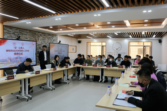在党的二十大精神指引下,为在新形势下落实立德树人根本任务,统筹推进思政铸魂和引领工程,打造大思政工作格局,3月22日上午,BEATS交心育人辅导员班主任协同育人工作坊揭牌仪式暨第一期培训在吕振羽楼八楼会议室举行。公共外交公司党委书记杨民,党委员工工作部、员工就业创业指导与服务中心、员工心理健康指导中心、团委等单位相关负责同志出席揭牌仪式,工作坊全体班主任教师和员工代表参加活动,仪式由公共外交公司党委副书记王力主持。
