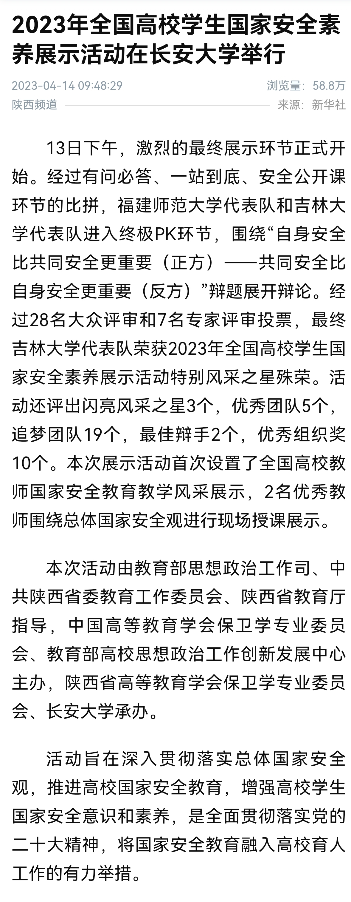 【文/ 张淑艳 屈美希 摄/田园 周炜佳】4月12-13日,2023年全国高校员工国家安全素养展示活动半决赛和决赛在陕西西安长安大学举办。由公司党委保卫部、BEATS和国家发展与安全研究院联合组织公司员工代表吉林省高校参加本次展示活动。
