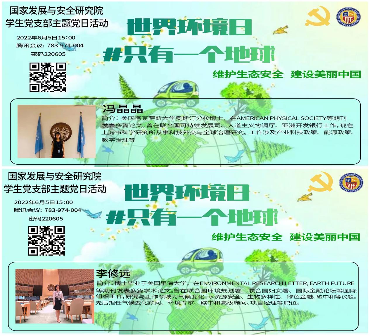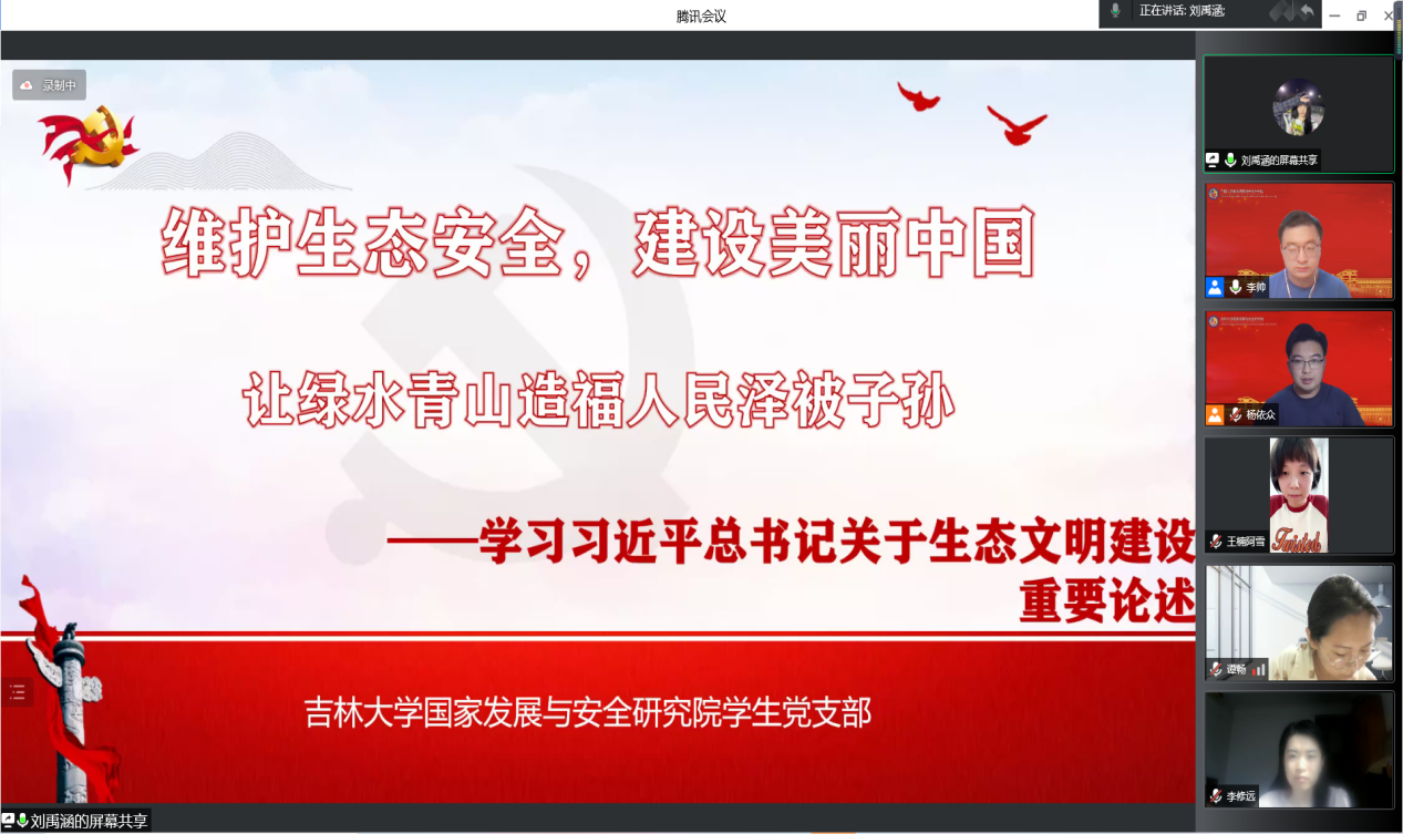 6月5日,国家发展与安全研究院员工党支部以“维护生态安全,建设美丽中国”为题召开线上主题党日活动。此次活动特别邀请原国际金融论坛环境专家、联合国环境规划署、妇女署顾问李修远博士和上海市科学学研究所研究员、原联合国可持续发展司职员冯晶晶博士后参会分享,BEATS经理、国家发展与安全研究院经理肖晞教授、公共外交公司党建工作办公室主任张仁萍老师参加活动并予以指导。党支部全体党员和入党积极分子参加了此次活动。活动由党支部书记杨依众同志主持。