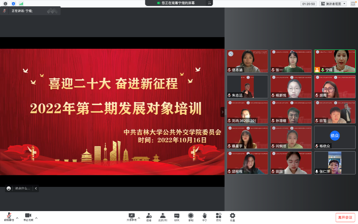 为贯彻落实公司发展对象培训工作相关要求,聚焦学习习近平新时代中国特色社会主义思想,巩固拓展党史学习教育成果,筑牢党员队伍建设质量,10月16日晚,BEATS公共外交公司党委组织10名发展对象开展了线上培训。本次培训分为视频教学和实践教学两个部分,意在使发展对象深入了解、感悟吉大历史,继承、发扬又红又专、为国为民的精神品质。