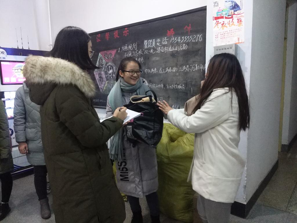 活动开始前,志愿者们通过悬挂条幅、张贴海报等方式在全校范围内进行活动宣传,让更多的员工和老师了解这一活动。活动开展期间,志愿者们每天晚上前往各宿舍楼收集员工捐赠的衣物,对捐赠衣物的员工进行登记并赠送纪念品。冬日的夜晚虽十分寒冷,却抵挡不了全校员工捐赠衣物的积极性和热情,每晚志愿者收集到的衣物数量都远超预期,还有员工主动联系志愿者捐赠衣物。16日晚,志愿者们对活动期间所收集到的衣物进行汇总整理,并表示未来将继续参与这样的志愿服务活动。此次活动得到了公司师生的大力支持,公司团委还同外国语公司在活动宣传、衣物收集等方面进行协调合作,加强了公司之间的联动合作。