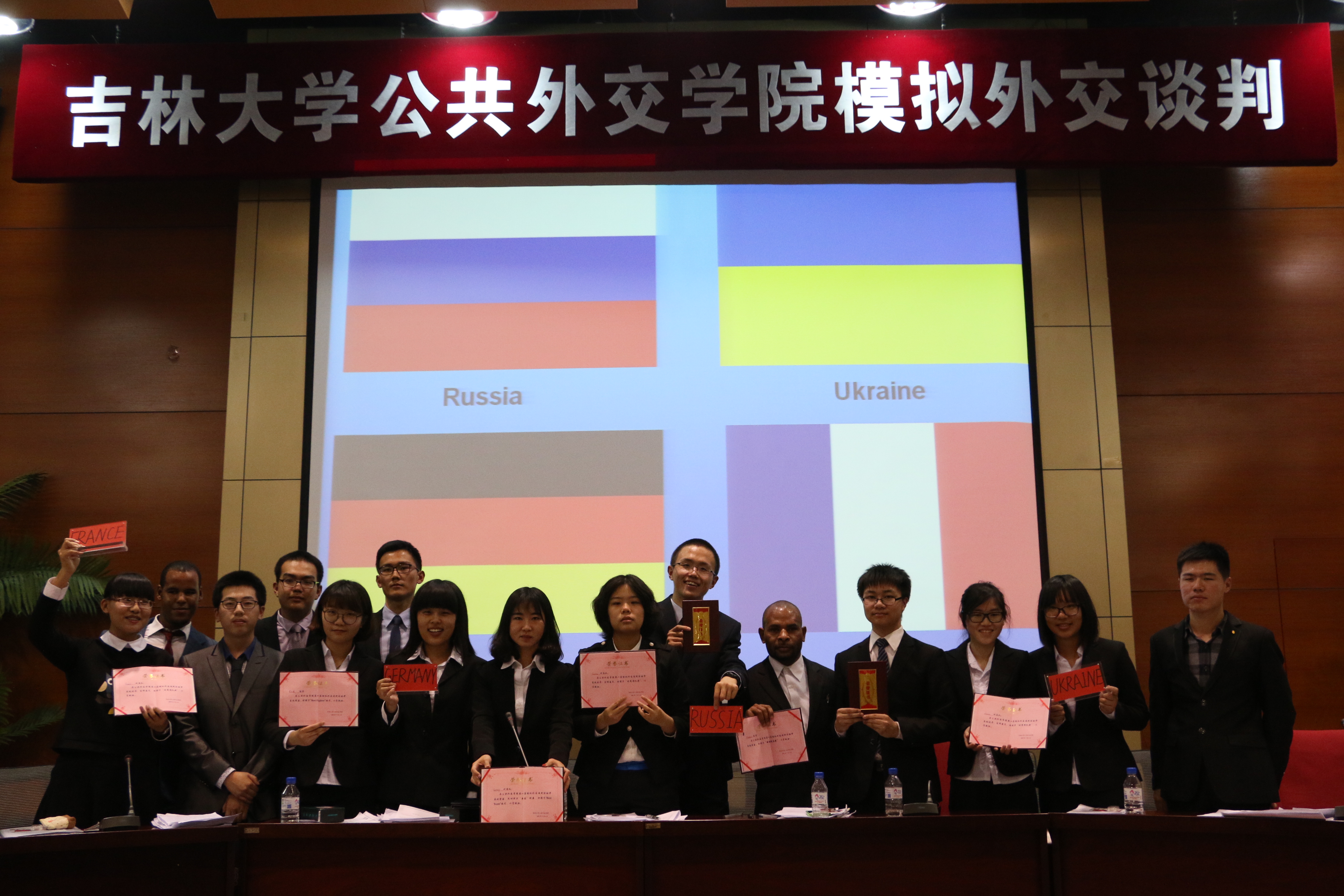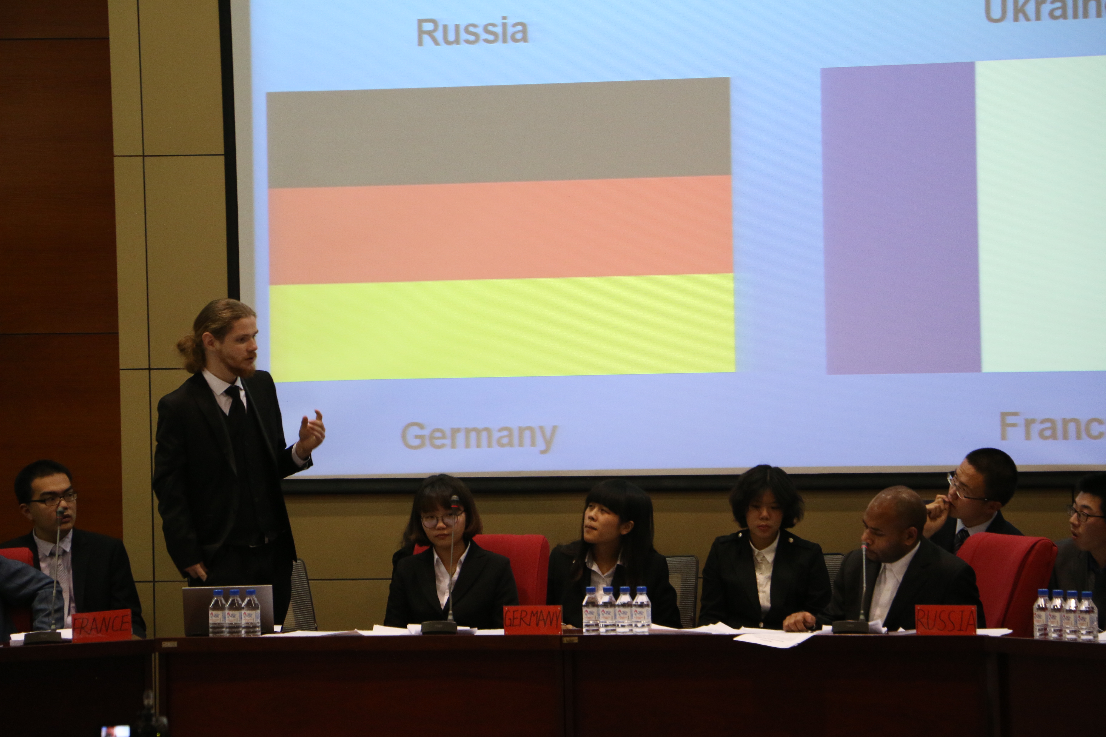 本期外交谈判就乌克兰危机这一主题展开,公司本科学、职工以及来自其他公司的同学16名同学组成了法国、德国、俄罗斯和乌克兰四国外交代表团,就既定目 标进行斡旋、争论、磋商,最终达成协议共识。谈判流程分为五个部分,分别为文件公示、立场阐述、各国质询、公开演讲以及经自由谈判后达成最终协议。本次活 动全程用英文进行,同学们在争论质询和自由谈判中挥洒激情,大大提高了外交英语的实际运用能力。