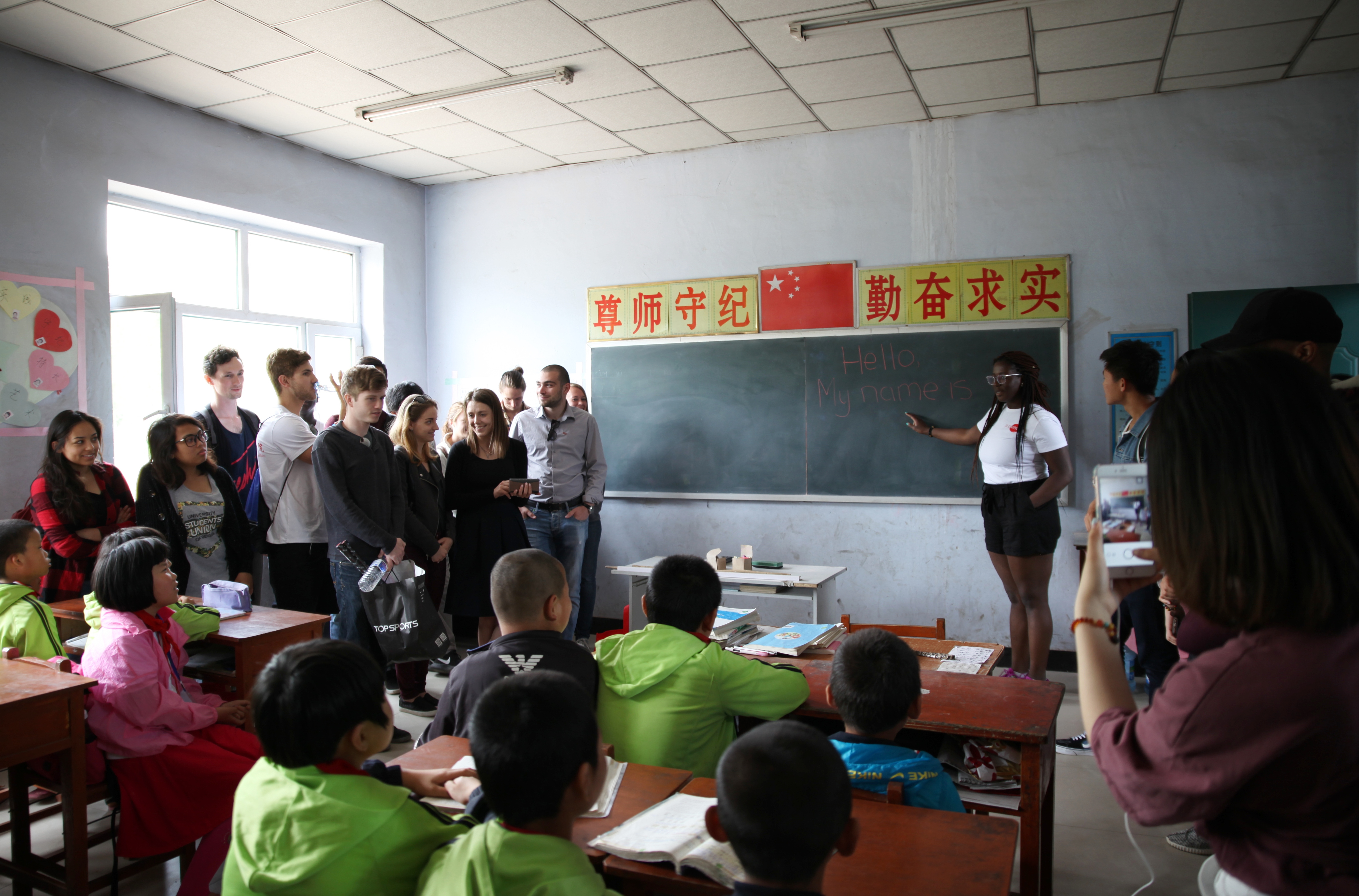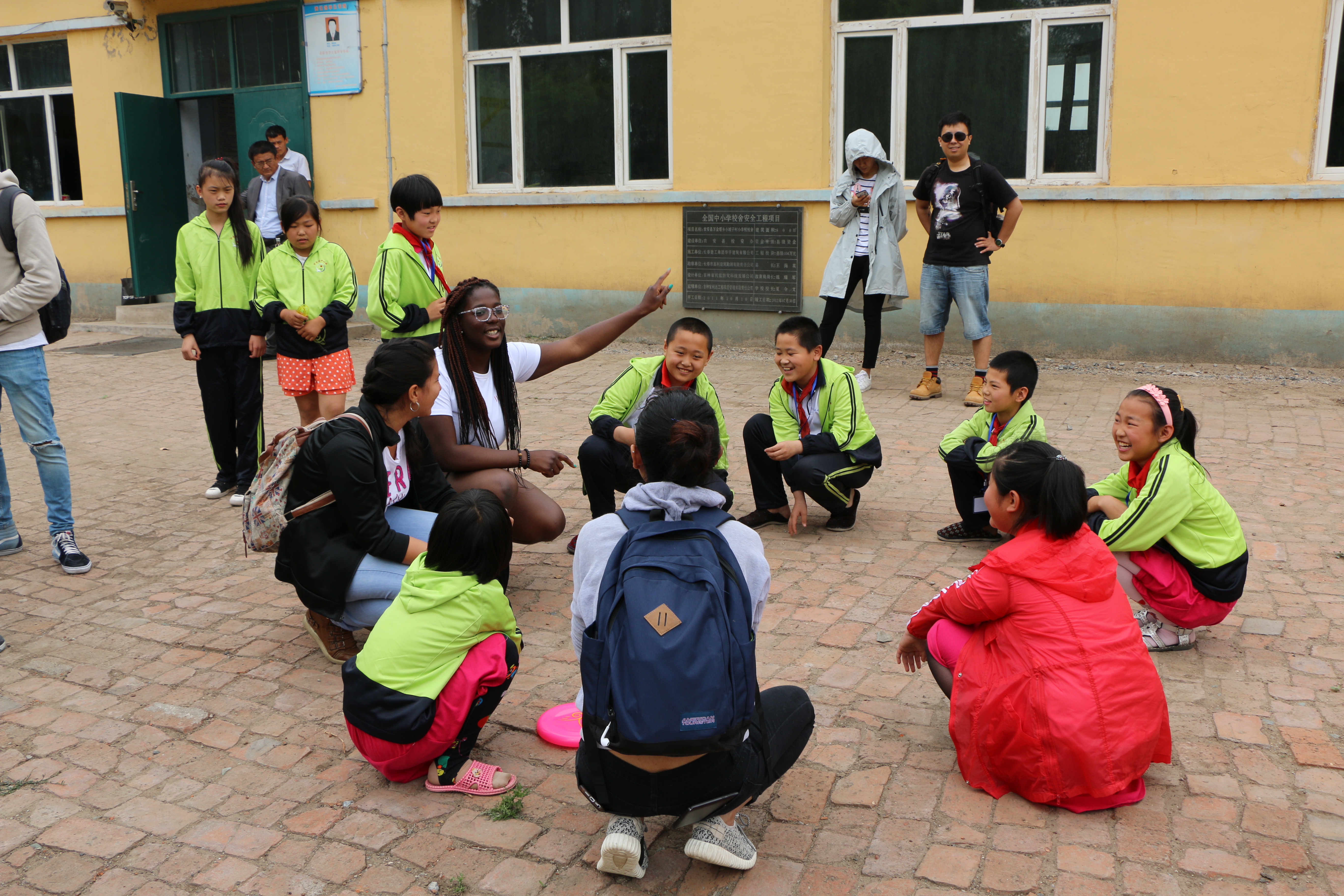 短暂介绍过后,我们开始进行第一个小活动。由来自加拿大里贾纳大学的Faith同学教小朋友们如何用英语介绍自己。Faith首先在黑板上写下大大的“hello,my name is……”几个字,然后小朋友们一个词一个词地跟着Faith老师念了出来。随后,BEATS的职工同学带小朋友们唱英文歌,小朋友们开心地融入到活动中。小朋友们也为远道而来的客人们表演了《让我们荡起双桨》等经典儿歌。节目过后,我们的职工向小朋友们赠送了零食,文具和体育用品。我们的加拿大朋友们还绕有兴致地与小朋友们在操场上玩起了飞盘,做起了游戏。晌午将至,职工和小朋友们依依不舍地道了别。