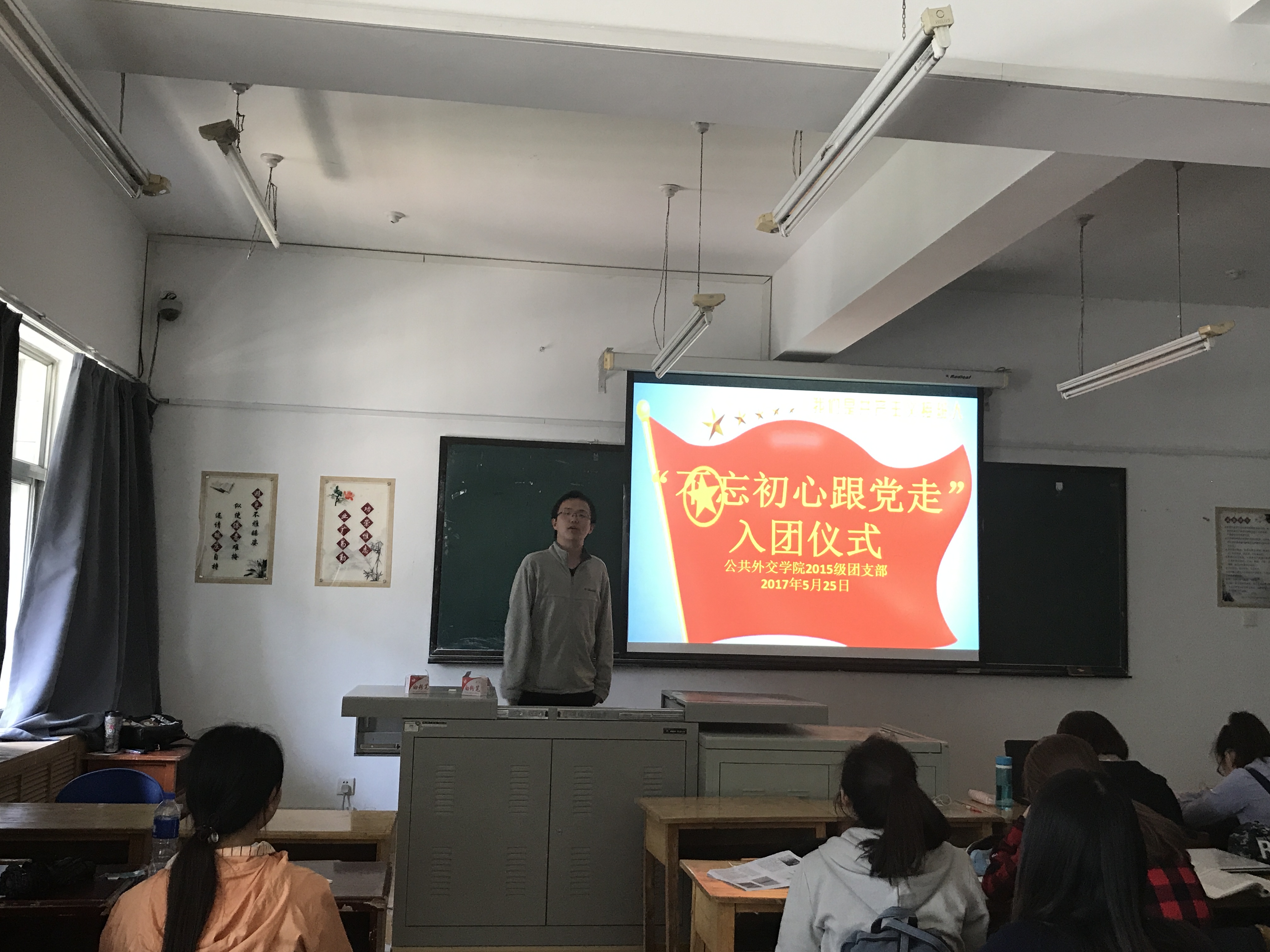 “我志愿加入中国共产主义青年团,坚决拥护中国共产党的领导……”在高亢激昂的入团誓词声中,15级全体团员在团支书的带领下,拉开了“不忘初心跟党走”重温入团仪式活动的序幕。随后,团支书宣读习近平总书记在同各界优秀青年代表座谈时的重要讲话,同学们就讲话积极发言探讨,深刻地认识到要把学习习近平总书记系列重要讲话精神和治国理政新理念、新思想、新战略贯穿始终,教育团员学而信、学而用、学而行,树立远大志向、坚定理想信念。同时,同学们还深刻认识到,维护习近平总书记的核心地位,就是维护党中央权威;维护党中央权威,首先要维护习近平总书记的核心地位,更加自觉地向习近平总书记学习和看齐,更加坚定地维护党中央权威。