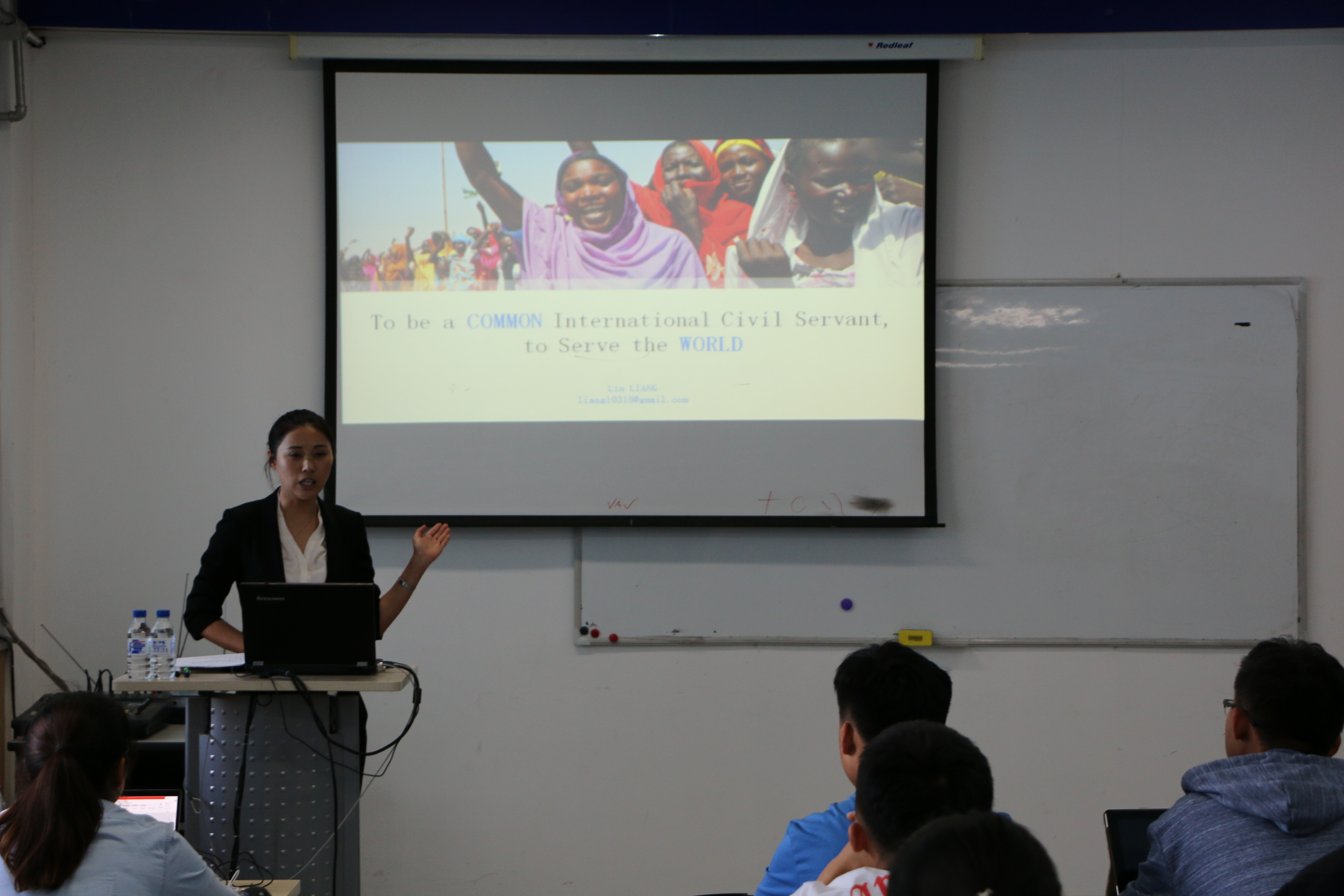梁琳博士通过向同学们展示短片的形式,讲述了自己工作中的故事,详细地介绍了关于联合国与联合国教科文组织的相关信息,将自己作为一名国际公务员的真实体会展现给同学们,并介绍了作为联合国工作人员的优惠待遇及中立的行为守则。
