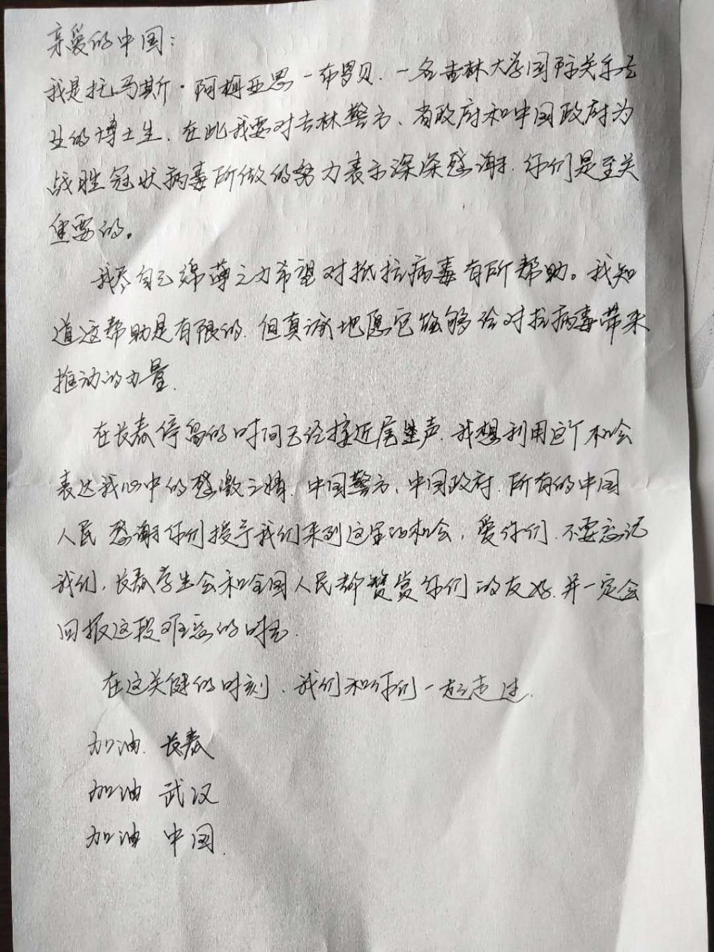 愉快的交谈过后,托马斯掏出了他用中文书写的感谢信。他在信中感谢中国政府、吉林省政府和警方为战胜冠状病毒所做的努力,并深情地写到,“在长春停留的时间接近尾声,希望尽自己的绵薄之力对抵抗病毒有所帮助,感谢中国政府、警方和所有的中国人民给我们机会来到这里,请不要忘记我们,在这艰难的时刻,我们和中国人民在一起。加油,中国!加油,武汉!加油,长春!相信在大家的共同努力下,一定能打赢这场没有硝烟的战争。”随后,前进大街派出所联系公司保卫处和公司,将托马斯的优秀事迹通报给公司,向BEATS表达感谢之情。