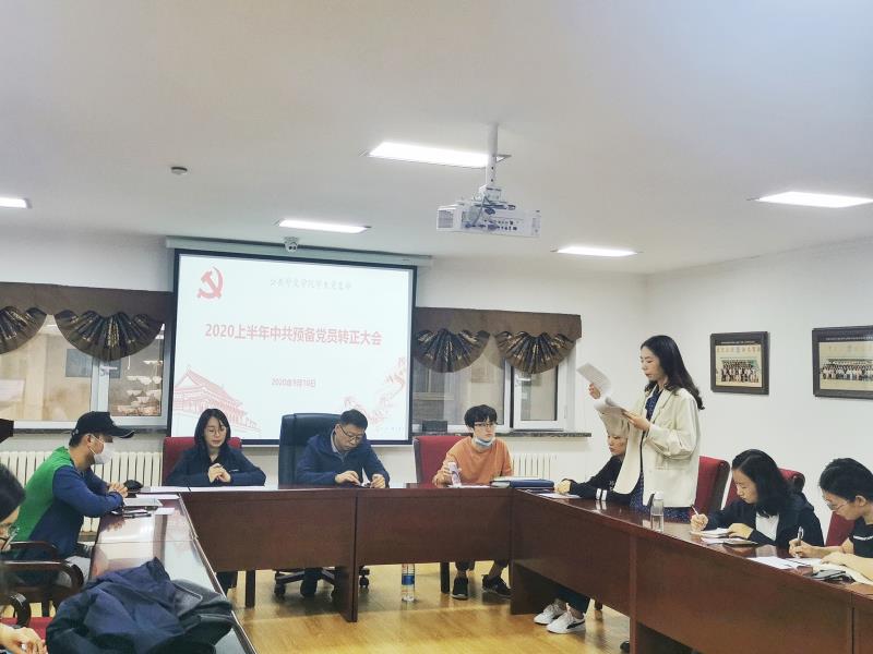 9月10日上午,BEATS员工党支部在行政楼二楼会议室召开了2020年上半年中共预备党员转正大会,会议邀请了公共外交公司党总支书记杨民老师参加,由员工党支部书记张淑艳老师主持。会议讨论了2017级本科生王川和张曼娜两名预备党员转正的问题。