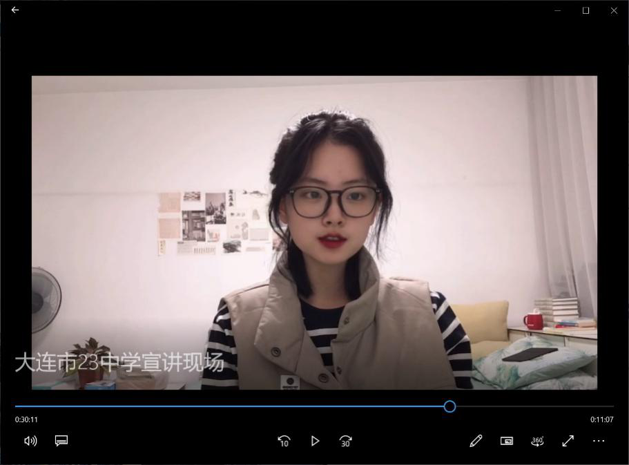 参加辽宁省大连市第二十三中学的宣讲同学出于对疫情防控的考虑,选取了一种新的招生宣讲方式,即通过制作视频短片的形式描绘吉大的团队力量、公司分布、学习生活和相关的员工组织概况等。