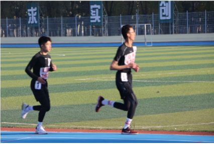 早晨8:00,男子3000米选手黄浩同学(右一)整装待发。一声令下,他如轻箭脱弦,身影疾驰而出。