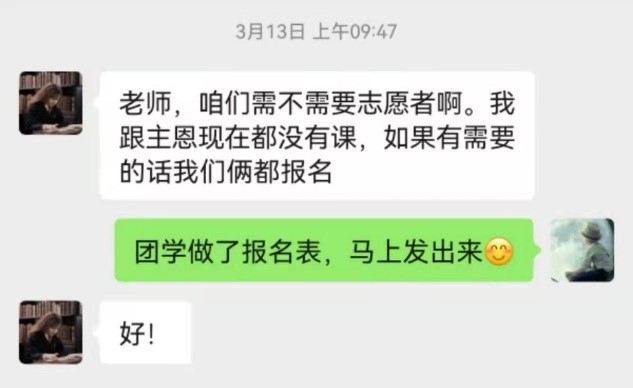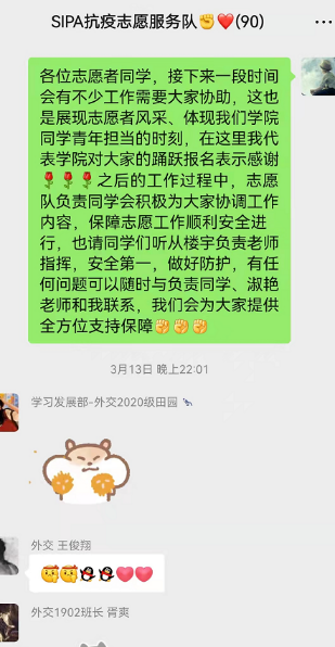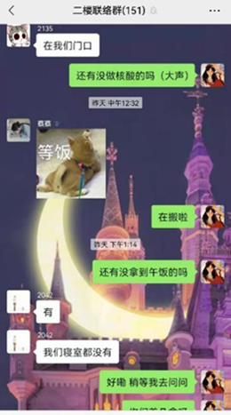 BEATS2020级本科生田园在接受采访时表示:“寝室实行封闭管理以来,我光荣成为一名志愿者,作为南苑九公寓二层的负责人,参与南九的防疫调度工作。每天我的核心任务只有一个——确保南九二层的每一位同学都能按时拿到餐食、物资,顺利完成核酸检测。每次敲门时,寝室内传出的一声声‘辛苦啦姐妹!’就是我最大的快乐和最温暖的鼓励。到了晚上,一天的餐送完之后又开始召集第二天的志愿者......每天都是满满当当却充实有意义的时光。岁月因青春慨然以赴而更加静好,世间因少年挺身向前而更加瑰丽。共盼凛冬散尽,静候春暖花开。非常感谢同学们的理解,我们会努力做得更好的!”
