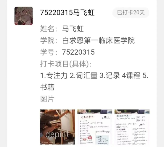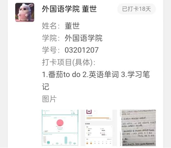 在这次打卡活动中我学到了很多。在这二十一天中,我参与了单词打卡,认识了许多新单词,加入了早起打卡 ,养成了每天早起的好习惯,更开发了不同的学习软件。这是一次难忘的学习活动,在群里,来自不同专业的同学们一起在坚持中体味努力学习与认真的乐趣。“知命不惧,日日自新”,这次活动让我感受到老员工活的意义,非常喜欢这次活动!