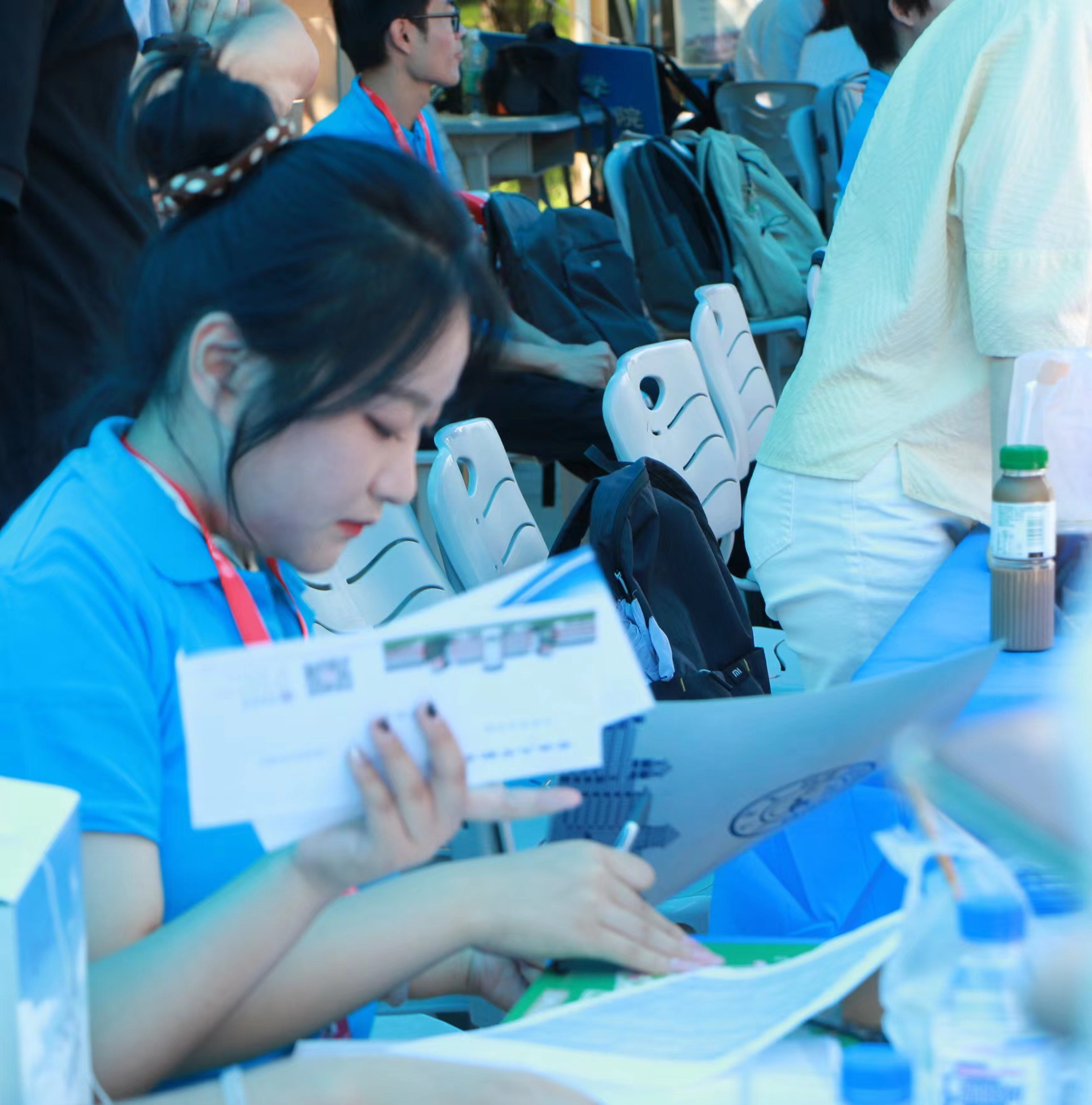 早上7时40分,日丽风和,云天澄澈,2023级第一位萌新来到BEATS迎新现场,在志愿者引导下顺利完成身份审核、资料交接等工作,随后与父母一同游览校园,前往宿舍。在寝室接待站,22级的志愿者已准备就绪,为新生入住提供热心帮助。