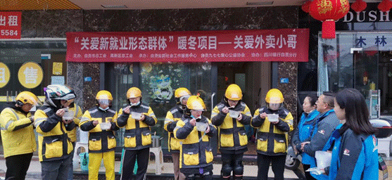 本次社会实践BEATS“春风送暖入蜀冬”小队,协助自贡市总工会、自贡市高新区总工会、自贡盐韵社会工作服务中心、自贡九七七爱心公益团体,前往外卖工作者一线开展工作实情调查,收集农民工新就业形态群体相关动态信息,送上温暖与祝福,并提出相关建设性意见,提升社会温情,助力西部地区乡村振兴可持续发展。