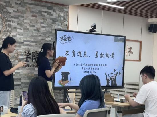随后,辅导员为同学们分发自己四年前寄出的信。信中或深情、或幽默、或励志,每一句话都凝聚着四年前同学们对大学的憧憬。回忆与期望交织,情感在笔尖传递。在特质的留言册上,同学们用最真挚的话语记录下对同窗的祝福、对师生的感激以及对自己的期许。
