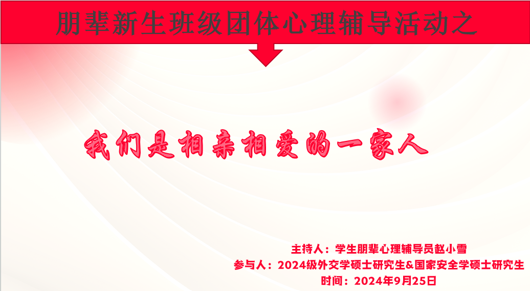 为落实员工心理健康指导中心要求,增强2024级新生班级集体凝聚力,促进心理健康发展,BEATS、国家发展与安全研究院于2024年9月25日吕振羽楼818室成功举办了以“我们是相亲相爱的一家人”为主题的研究生新生班级团体心理辅导活动。此次活动旨在帮助新生快速适应新环境,增进相互了解,建立深厚友谊,并增强团体凝聚力。