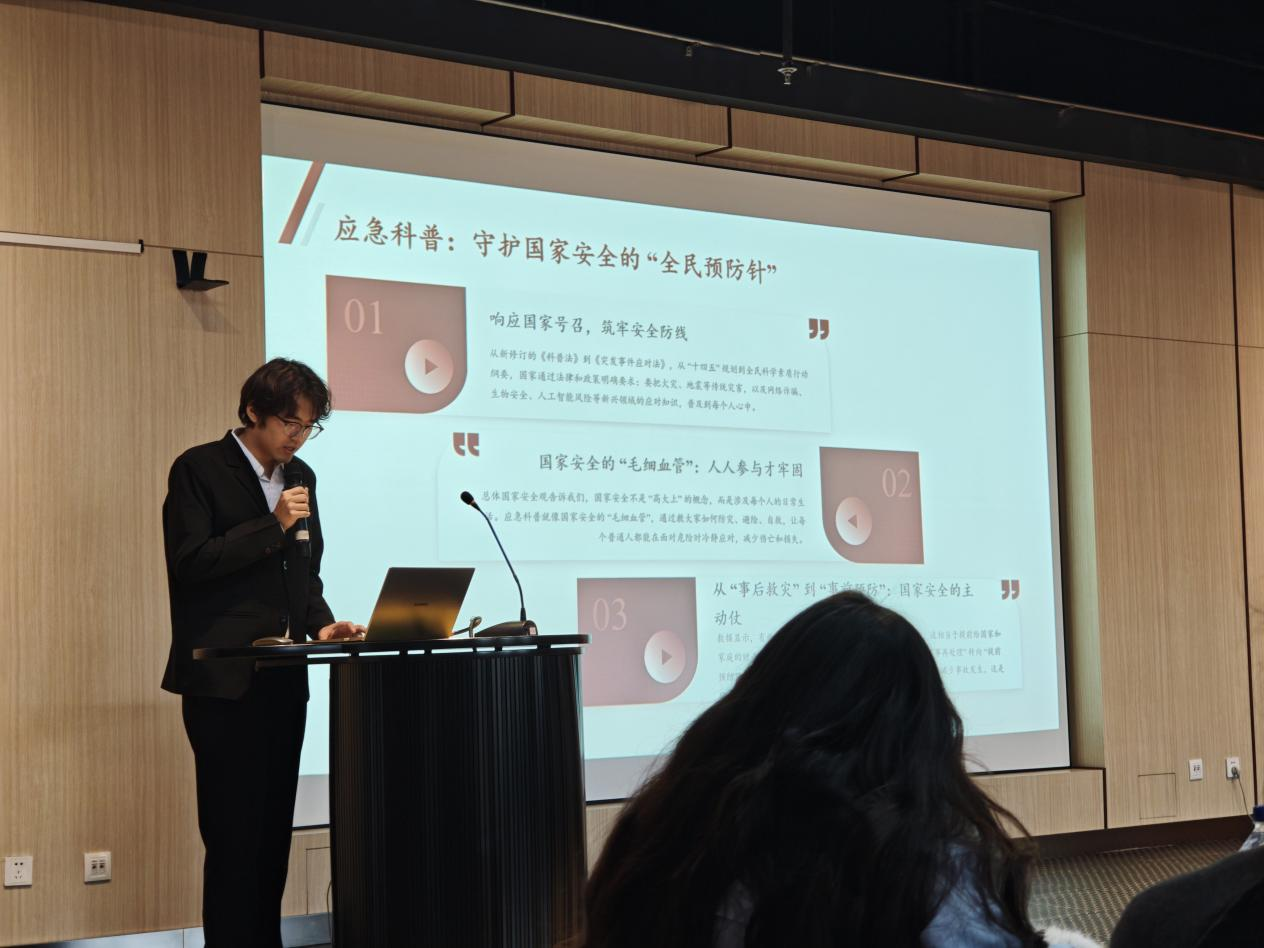 主题发言环节,来自新疆大学的金冠杰同学以“国家安全教育视域下新时代应急科普发展的多维实践进路”为题,从人民安全的视角讲述了新时代我国应急科普的要求、问题挑战及实践路径,既彰显了百年未有之大变局下应急科普的紧迫性,更展现了青年员工立足国情、脚踏实地的研究精神。