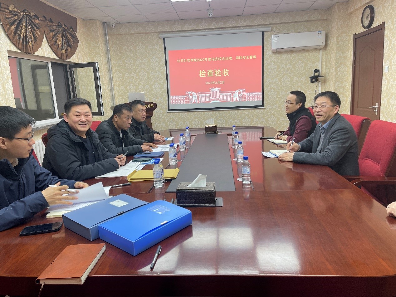 2023年3月2日下午,由保卫处副处长周鹏、党委办公室正科级秘书李卿功、保卫处消防科副科长董立明、治安科副科长赵明组成的公司2022年度治安综合治理、消防安全管理检查验收工作组到BEATS开展检查验收工作。公共外交公司党委书记杨民、行政副经理于洪生、院办主任沈毅、工作人员苏文杰等参加检查验收会议。