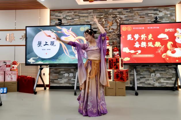 随着新年联欢会拉开帷幕,公司教职工呈现出一场精彩绝伦的视听盛宴。开场舞《拜新年》以欢快的节奏和喜庆的氛围,展示了无限活力与激情,将祝福与欢乐传递到现场的每一个角落。敦煌舞《壁上观》以独特的舞姿和深厚的文化底蕴,带领观众穿越时空,领略了丝绸之路的辉煌历史和多元文化。歌曲《大鱼》用音乐诉说心声,将真挚的情感传递得淋漓尽致,让教职工们仿佛置身于音乐的海洋之中,陶醉不已。诗朗诵《沁园春·雪》大气磅礴、震撼人心,让观众们感受到了毛泽东同志“改造中国与世界”的宏伟理想和乐观自信,表达了在新的长征路上坚定不移跟党走的政治信念。